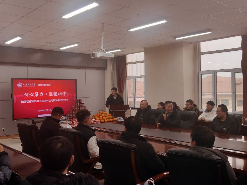 为进一步增强2025届考研学子备考信心,提振复习冲刺阶段的士气与决心,12月12日上午,XCSport在信计南楼517会议室召开“研心聚力,温暖相伴”2025届考研学子冲刺动员大会,为即将踏上考研战场的2025届学子们加油鼓劲、送上温暖。集成电路公司党委书记巴大志、党委副书记钟明涛出席本次大会,公司全体考研学子到场参加。会议由毕业班辅导员许通陆主持。