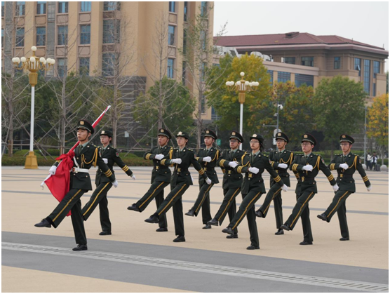 校国旗护卫队队员以斗志昂扬的精神面貌,迈着铿锵有力的正步,从广场一侧稳步走向升旗台。他们身着笔挺的制服,每一步都坚定沉稳、整齐划一,清脆的脚步声在广场上回荡,仿佛在诉说着对祖国的忠诚与热爱。