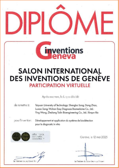 2025年4月,在瑞士举行的第50届日内瓦国际发明展(International Exhibition of Inventions Geneva)上,由XC体育人工智能微纳传感山西省重点实验室与武汉明德生物科技股份有限公司、浙江泰林生物技术股份有限公司联合研发的“体外诊断生物传感系统的创制与应用”成果,在全球40多个国家及地区超过1000个参展项目中脱颖而出,荣获金奖,实现公司在国际顶级科技舞台上的新突破。