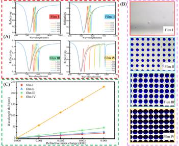 在这项研究中,研究人员创新性地开发了一种基于光子-等离子体耦合增强的法诺共振生物传感平台。该传感器由聚甲基丙烯酸甲酯(PMMA)微孔阵列波导、MY-131-MC(MY)介质层和银基等离子体层组成。这种结构设计能够精确调节局部光子场与微孔膜之间的空间耦合,使探测光的电磁场与微孔阵列波导有效重叠。此外,三维微结构增强了光物质相互作用的强度。实验结果表明,该传感器在折射率(RI)检测方面实现了 56.24 μm/RIU 的超高灵敏度,比传统的 Fano 型传感器(4.9 μm/RIU)提高了 11.4 倍。品质因数 (FOM) 提高到 2,998.94 RIU-¹,比传统的 SPR 传感器高出两个数量级。该平台被用于检测肿瘤生物标记物癌胚抗原(CEA),测量灵敏度为 4.03 nm/(ng/ml),检测限(LOD)为 81.8 pg/ml。此外,该方法还具有极佳的选择性、重复性和稳定性。这种简单而经济的方法为开发生物传感应用中的高性能 SPR 传感器提供了一种新策略。
