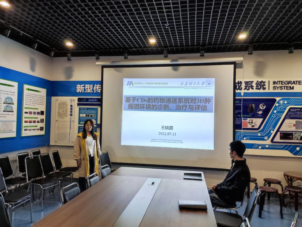 本次学术报告汇报人为王晓圆博士,汇报的内容是基于CDs的药物递送系统对3D肿瘤微环境的诊断、治疗与评估。王晓圆博士结合近期较高水平的论文,阐述了当前基于CDs的药物递送系统对3D肿瘤微环境诊断、治疗与评估的发展及其最新研究进展。随后基于CDs药物递送系统的构建问题,提出功能化CDs的开发及其在3D肿瘤微环境中定位、成像和治疗“一体式”诊疗体系的实现。通过相关领域研究成果的介绍,体现了基于CDs药物递送系统的应用价值。参会的各位老师员工就学术报告相关内容进行了热烈的讨论。