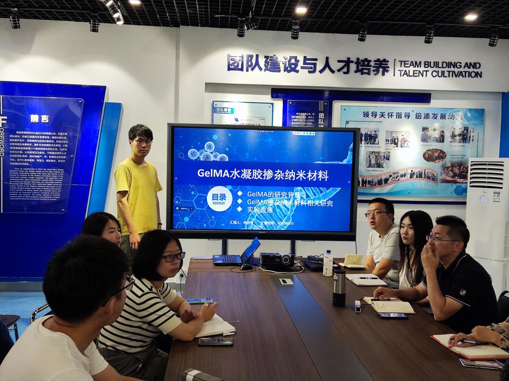 本次学术报告汇报人为申治中博士生,汇报的内容是GelMA水凝胶掺杂纳米材料的相关研究。高分子水凝胶是一种非常吸引人的材料,可用于组织修复的3D支架及治疗分子和细胞的传递系统。其中,甲基丙烯酸明胶(GelMA)已成为一种具有代表性的水凝胶材料,在生物医学领域有着广泛的应用。申博士首先介绍了调节GelMA水凝胶理化性能的不同方法,基于GelMA的水凝胶研究致力于将其与生物活性和功能纳米材料结合,旨在增强GelMA的物理化学和生物性能。接着,针对纳米材料掺杂的相关研究进行了重点介绍,包括对碳纳米管、氧化石墨烯、纳米银颗粒、磁性纳米材料等多种纳米掺杂材料的相关研究。最后,介绍了自己的研究进展,及未来研究计划。参会的各位老师、员工就学术报告相关内容进行了热烈的讨论。
